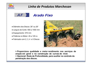 O documento apresenta a linha de produtos da Marchesan, incluindo aradoes fixos e reversíveis, distribuidores de calcário e adubos com diferentes capacidades e larguras de distribuição.