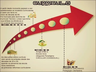 The document traces the evolution of curriculum concepts over different decades from the 1920s to the 1990s in Brazil. It discusses early notions of curriculum as a set of disciplines or schedule, then explores definitions by Bobbitt and critiques by Paulo Freire. It outlines shifts from teacher-centered, discipline-focused curriculum to ones aimed at developing student autonomy and emancipation through knowledge.