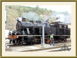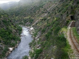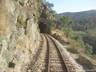 Este documento apresenta fotografias e descreve a paisagem ao longo da linha ferroviária entre Tua e Ribeirinha no nordeste de Portugal. Apresenta as estações e túneis ao longo da linha, destacando a beleza natural do desfiladeiro do rio Tua. No entanto, nota o estado de abandono da linha e das estações e expressa tristeza pois a barragem planeada vai submergir parte significativa da linha.
