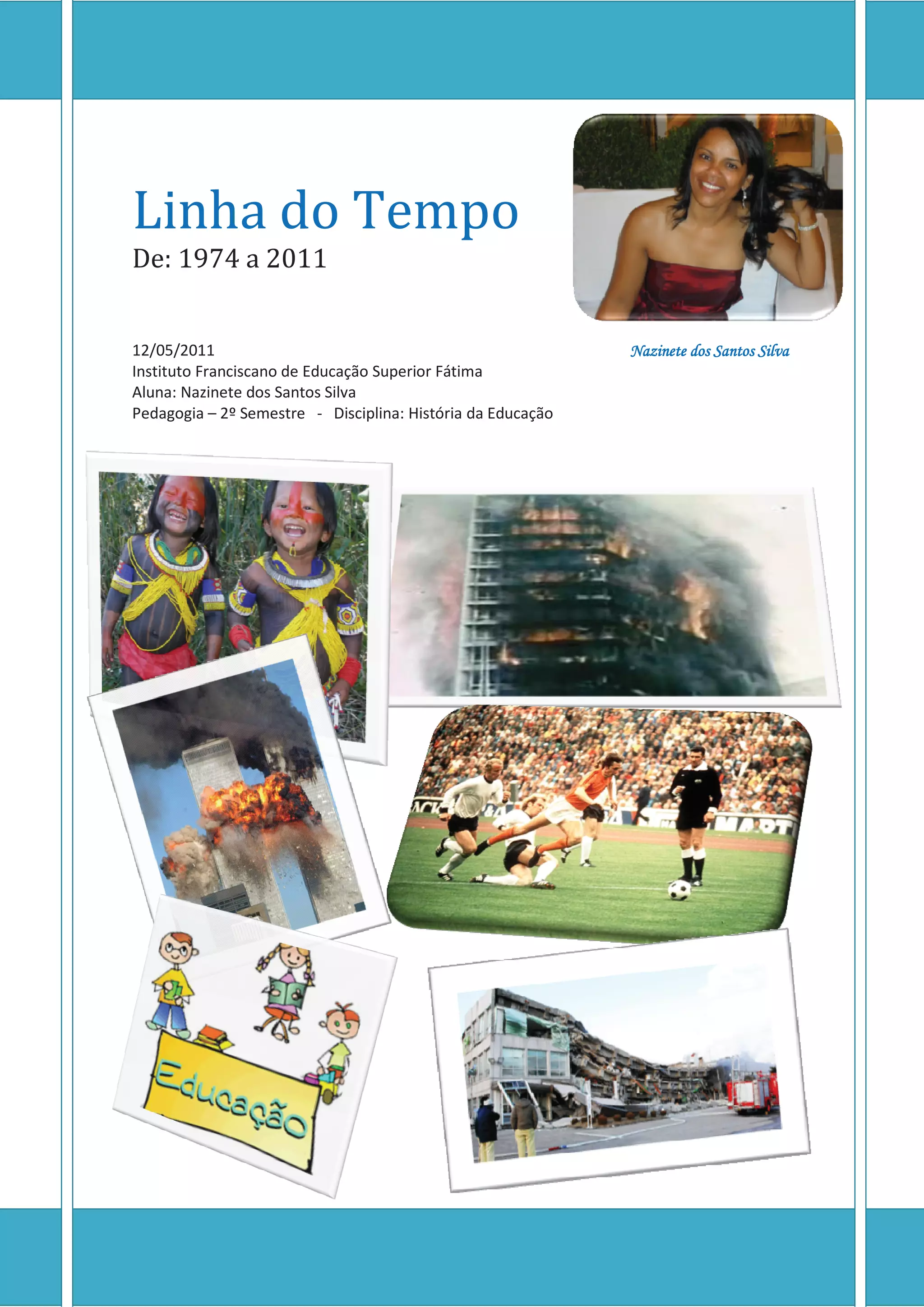 O documento descreve eventos ocorridos entre 1974 e 2010, incluindo o nascimento de Nazinete dos Santos Silva em 1974, o incêndio no Edifício Joelma em São Paulo no mesmo ano e a Copa do Mundo de 1974 realizada na Alemanha Ocidental. Também menciona acontecimentos posteriores na vida de Nazinete como o início dos estudos em Pedagogia em 2010.