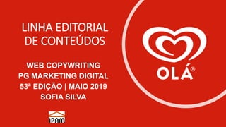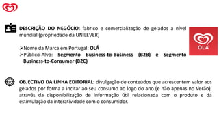 O documento descreve a linha editorial de conteúdos da marca de gelados OLÁ para promover o consumo dos seus produtos durante todo o ano através de várias plataformas digitais. A marca atualmente usa seu website e redes sociais para divulgar informações sobre produtos, públicos-alvo específicos e eventos. O documento sugere desenvolver mais conteúdos como um blog e melhor usar Instagram para engajar consumidores fora da estação de verão.