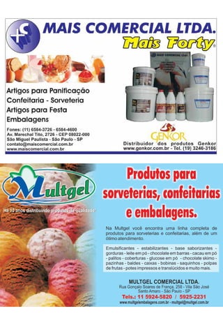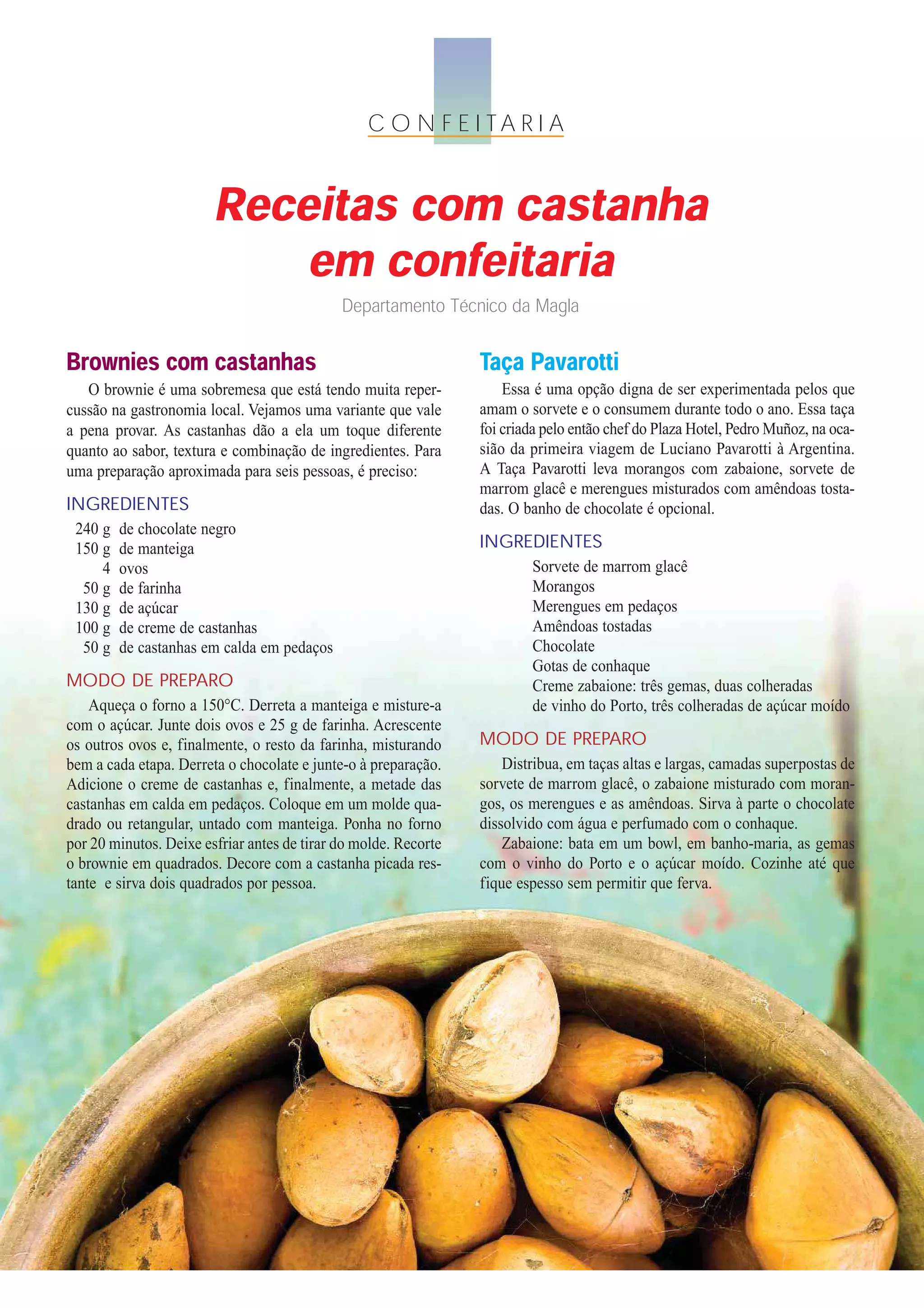 Este documento fornece receitas de sobremesas e confeitos com castanhas e ingredientes típicos da confeitaria brasileira. As receitas incluem brownies com castanhas, taça Pavarotti com sorvete de marrom glacê e merengues com amêndoas, e mil-folhas com mousse de cupuaçu e creme de goiaba. O documento também fornece instruções para preparar vários tipos de caldas, recheios e coberturas.