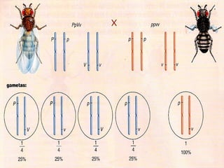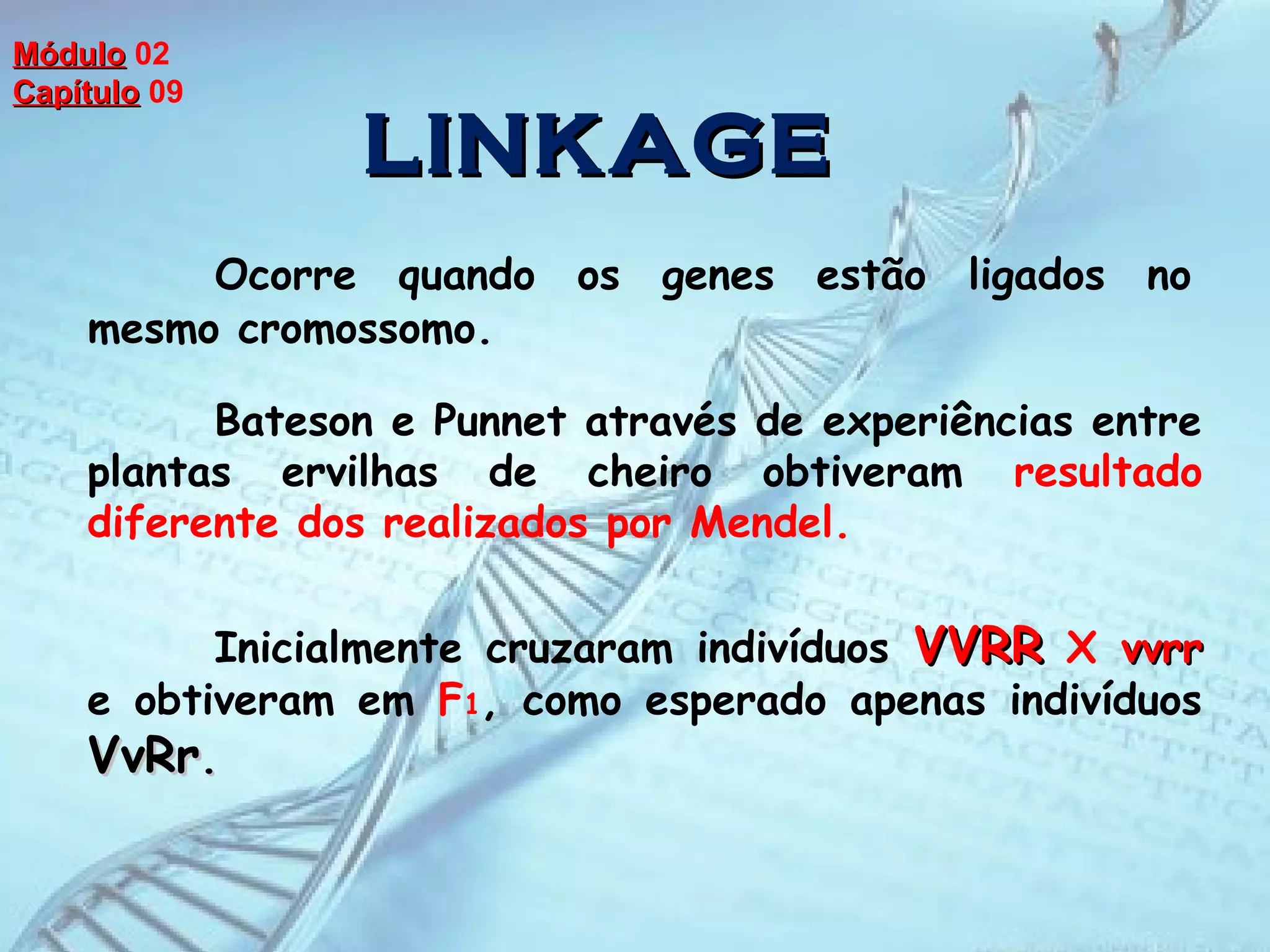 O documento discute linkage, que ocorre quando genes estão ligados no mesmo cromossomo. Bateson e Punnet realizaram experimentos com ervilhas que mostraram resultados diferentes de Mendel, levando-os a questionar a distribuição independente observada por Mendel. Morgan deduziu que a proximidade física dos genes no mesmo cromossomo explica por que eles não segregam independentemente, um conceito agora conhecido como linkage.