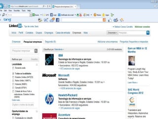 O documento descreve como o LinkedIn e o Flickr se diferenciam de outras redes sociais por terem um lado mais profissional. Ele também lista os objetivos e funcionalidades dessas redes, além de resumir sua história e inovações.
