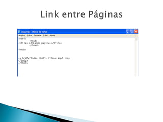 Após criar todas as páginas, é necessário conectá-las através de links usando a tag <A HREF> para especificar o caminho de uma página para outra, permitindo a navegação entre elas. O documento fornece um exemplo de como vincular uma página "Index.html" e "pag2.html" usando os caminhos relativos dentro das tags <A>.