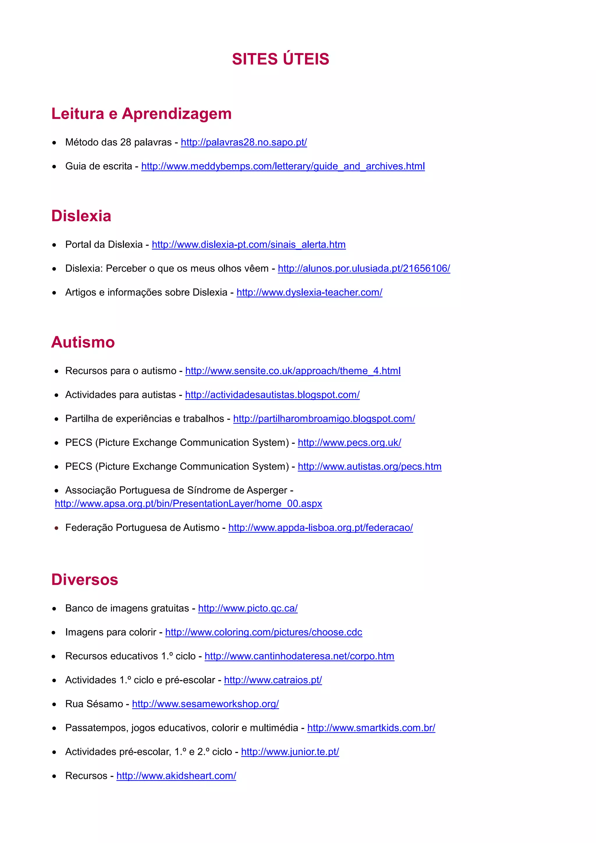 O documento lista vários sites úteis sobre leitura e aprendizagem, dislexia, autismo e recursos educativos diversos, incluindo banco de imagens, atividades para pré-escolar e 1o ciclo, jogos educativos e estimulação sensorial. Muitos sites contêm animações, jogos e conteúdos pedagógicos sobre diferentes matérias para crianças entre 2 a 12 anos. Alguns sites são dedicados a associações de autismo e deficiência.