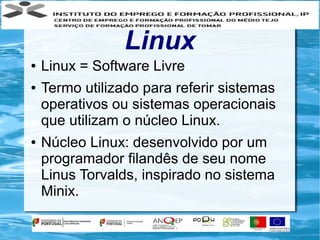 O documento resume o sistema operativo Linux, incluindo que foi desenvolvido por Linus Torvalds inspirado no Minix, é um software livre com código aberto sob licença GPL, e tornou-se popular com o apoio de grandes empresas de tecnologia.