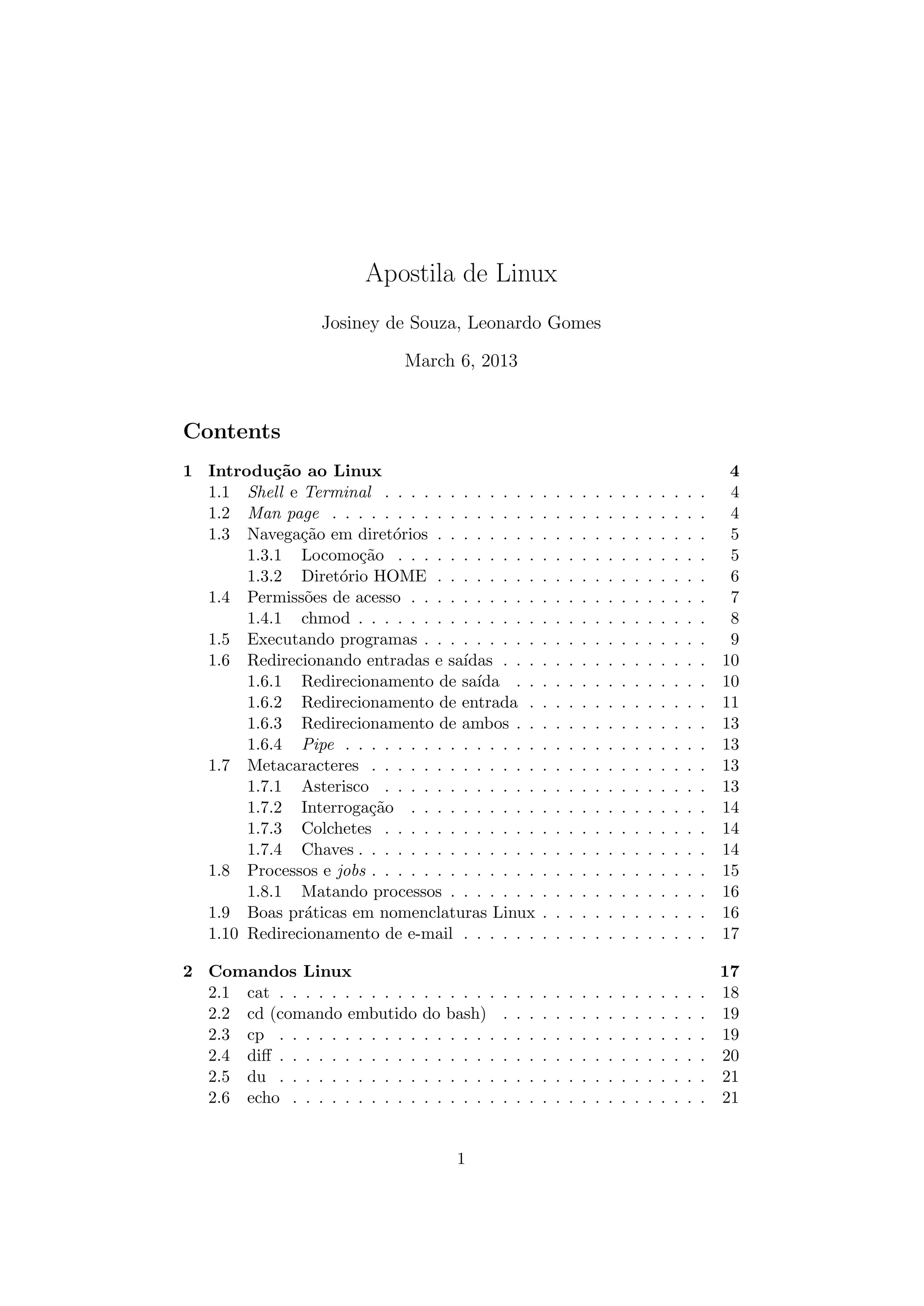 Este documento é uma apostila sobre Linux que ensina conceitos básicos do sistema operacional, incluindo navegação em diretórios, permissões de acesso, execução de programas e comandos. A apostila lista e descreve 33 comandos Linux comuns como ls, cd, cp, grep e tar.
