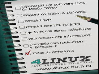 O documento apresenta alternativas open source para ferramentas de webconferência, incluindo DimDim, Big Blue Button e OpenMeetings. O documento também descreve uma apresentação sobre o assunto realizada no evento LinuxCon, com sorteios de prêmios para os participantes.