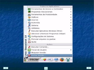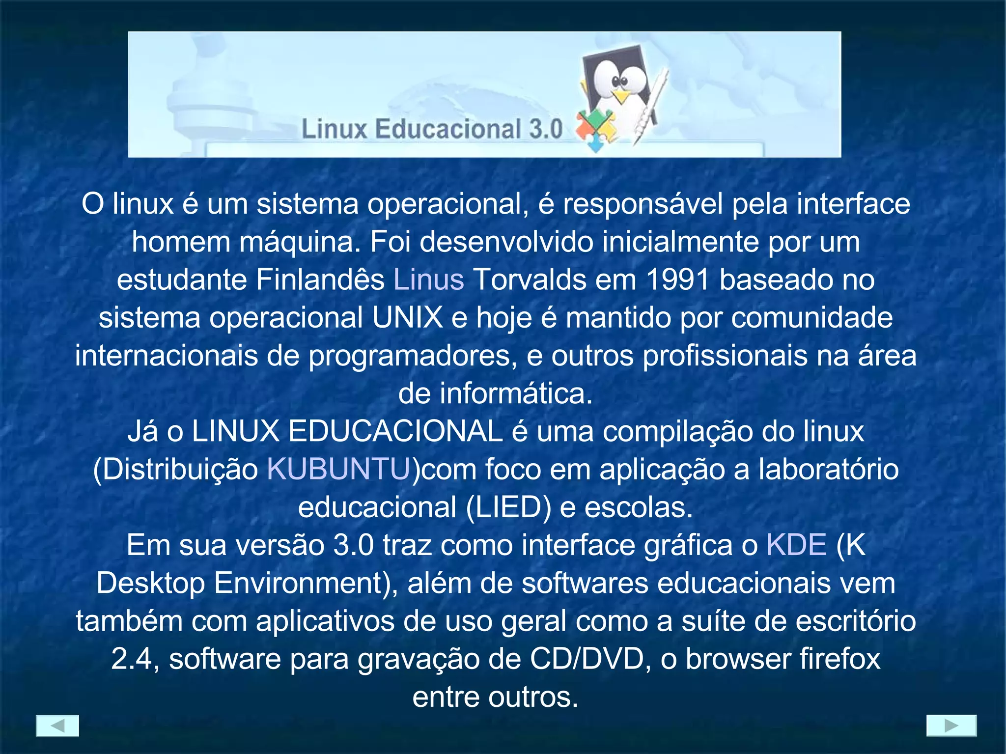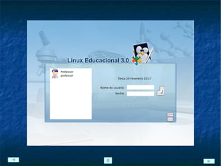 O documento descreve o sistema operacional Linux Educacional 3.0, incluindo suas características técnicas, programas instalados e interface gráfica KDE. O Linux Educacional é uma versão do Linux focada em aplicações educacionais e escolares, baseada no Kubuntu e trazendo diversos softwares educativos e de produtividade.