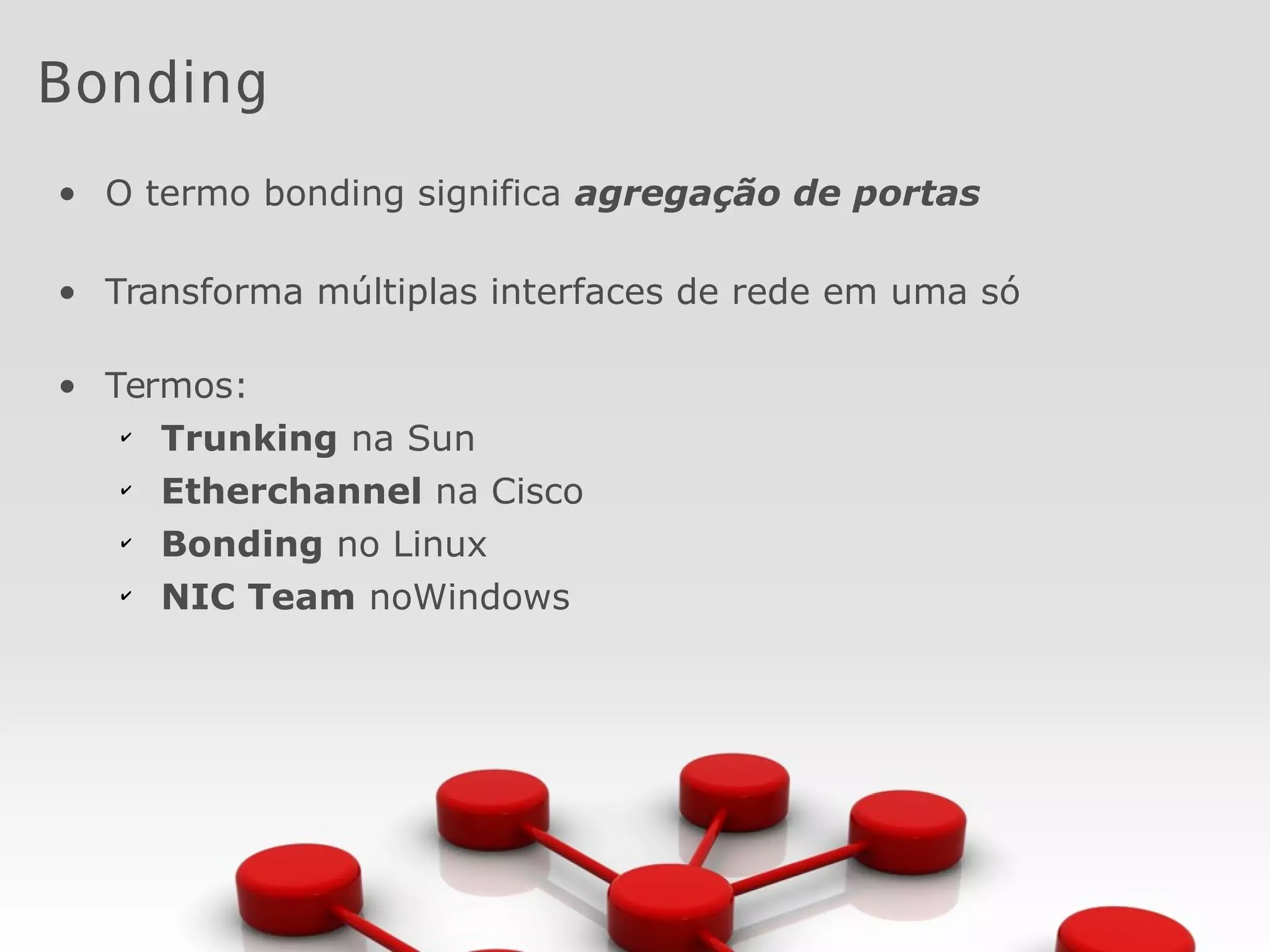 Bonding permite agregar múltiplas interfaces de rede em uma única interface lógica para prover tolerância a falhas e balanceamento de carga. Pode operar nos modos round robin, active-backup ou 802.3ad. A configuração envolve criar um arquivo para a interface bond e configurar as interfaces físicas como slaves, além de definir parâmetros como o modo e intervalo de checagem no arquivo bonding.conf.