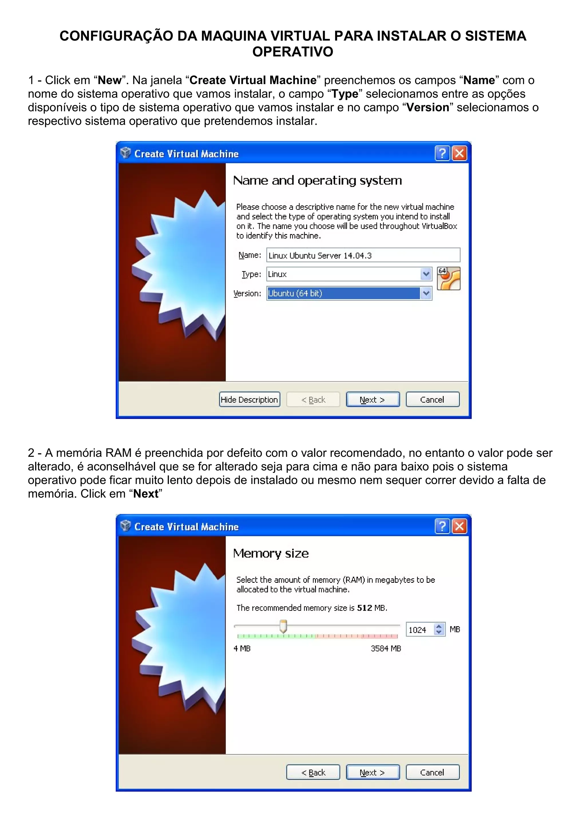 1. O documento descreve os passos para configurar uma máquina virtual no VirtualBox para instalar um sistema operativo Linux Ubuntu Server.