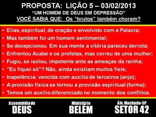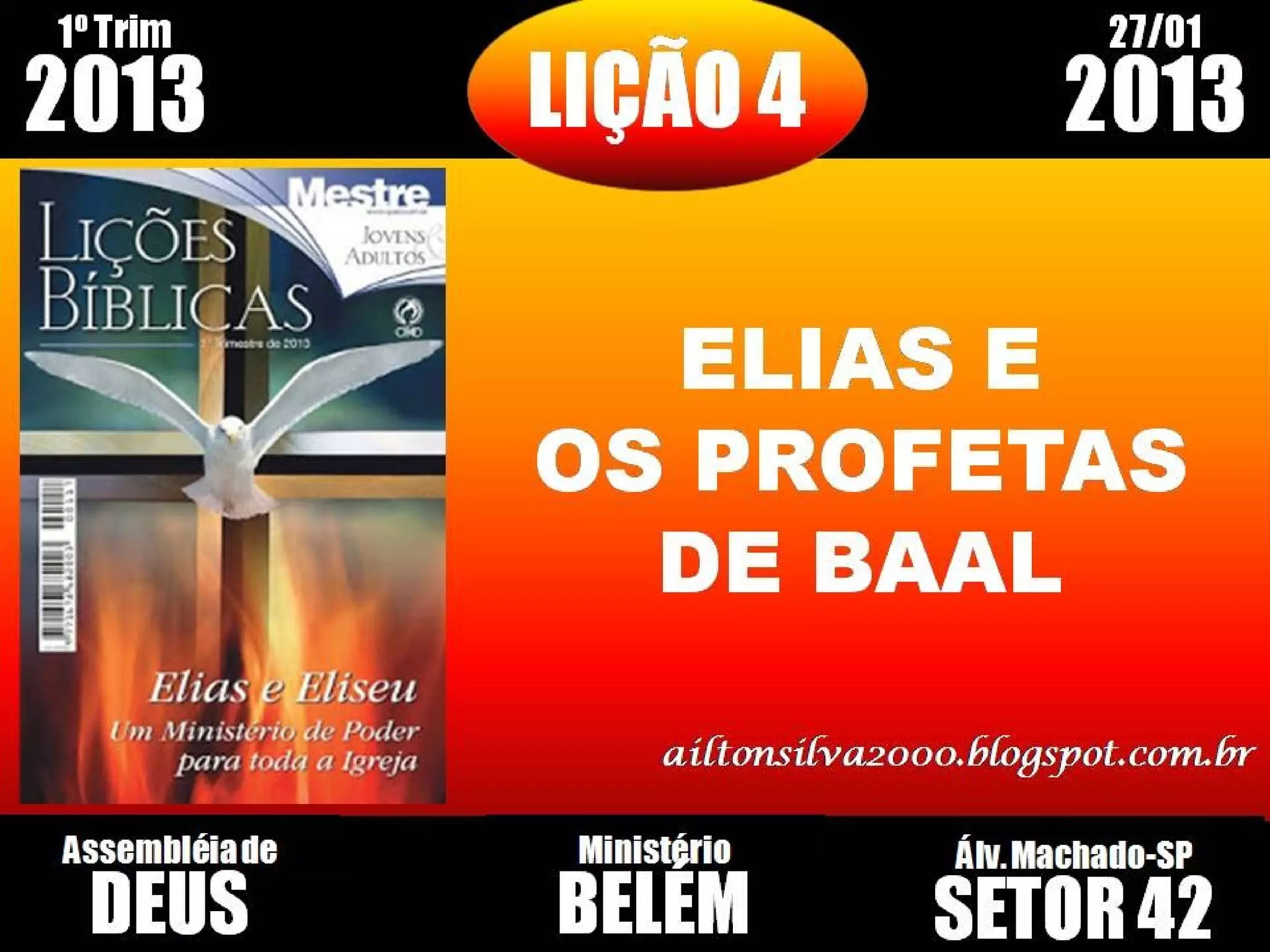 Este documento descreve uma lição bíblica sobre o confronto entre Elias e os profetas de Baal descrito em 1 Reis 18. O documento discute: 1) Como Elias desafiou o povo de Israel a escolher entre Jeová e Baal. 2) Como a adoração a Baal imitava mas não podia produzir fogo como Jeová. 3) Como o sincretismo religioso sempre ameaçou o povo de Deus.