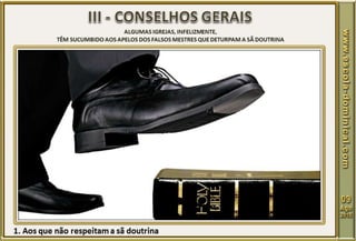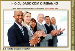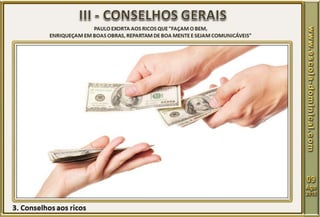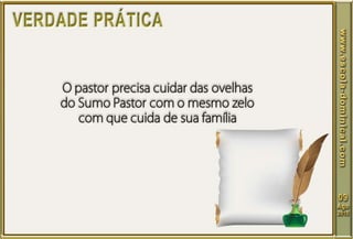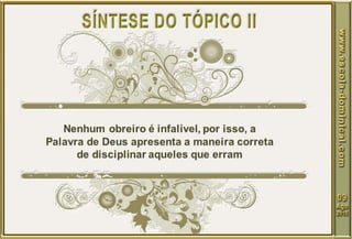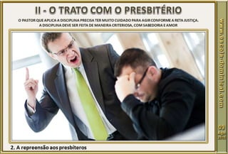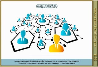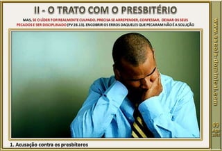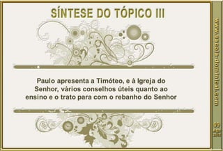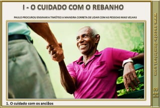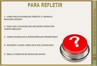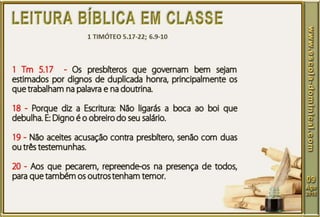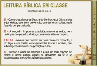 O documento analisa os capítulos cinco e seis da primeira epístola de Timóteo, destacando as instruções de Paulo sobre liderança na igreja, cuidado com diferentes faixas etárias e a importância da disciplina entre os presbíteros. Além disso, Paulo enfatiza a necessidade de apoiar os líderes fiéis e orienta Timóteo sobre a saúde e o tratamento das viúvas. Por fim, ele alerta sobre os falsos mestres e a ambição material, aconselhando a generosidade como parte da vida cristã.