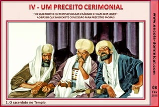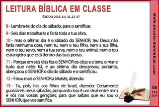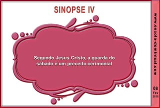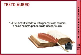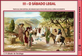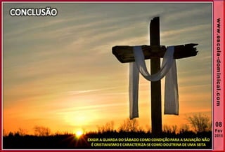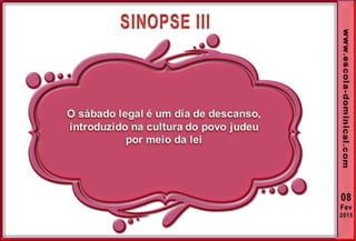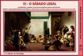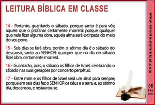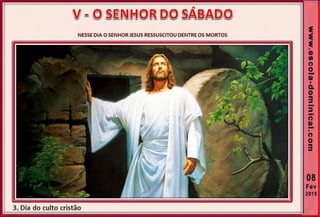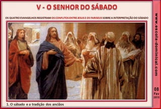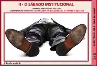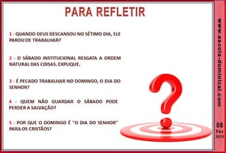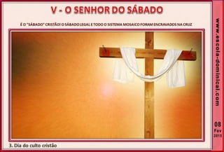 1. O documento discute a origem e significado do sábado desde a criação até o novo pacto cristão. Apresenta que o sábado foi dado inicialmente a Israel como um sinal distintivo, mas foi cumprido e revogado por Cristo, que instituiu o domingo como o dia do culto cristão.