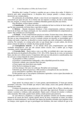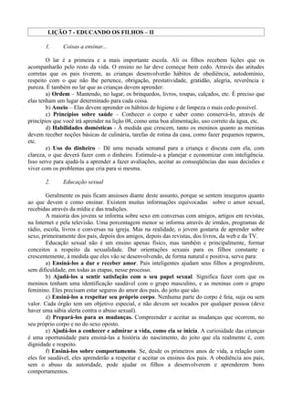 O documento discute sobre educar os filhos, abordando tópicos como ensinar ordem, asseio, princípios de saúde e habilidades domésticas no lar. Também fala sobre educação sexual, disciplina, influência da televisão e os impactos do divórcio nas crianças.