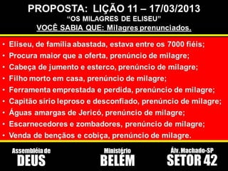 O documento descreve a história bíblica da viúva cujo azeite se multiplicou milagrosamente para pagar suas dívidas. Resume os principais pontos da lição: 1) Deus atendeu às necessidades da viúva por meio de um milagre; 2) Ela obedeceu às instruções de Eliseu de fechar a porta e encher os vasos com o pouco azeite; 3) O milagre glorificou a Deus e mostrou Seu poder em atender os sofredores.