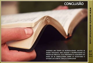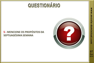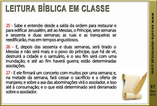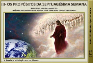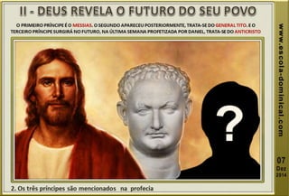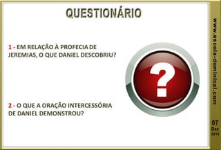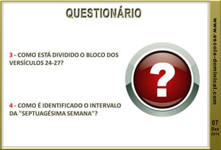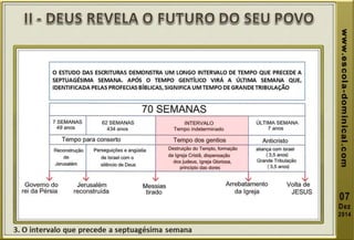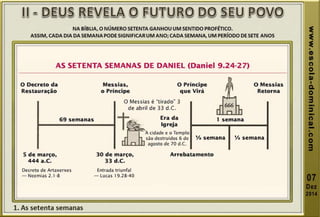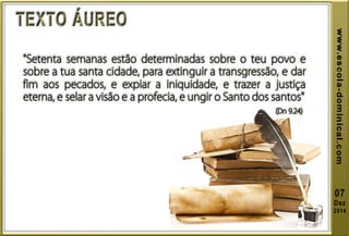 A lição 10 aborda a profecia das setenta semanas de Daniel, centrando-se na libertação de Israel do cativeiro, e explora a oração de Daniel em reconhecimento dos pecados do povo. O texto explica o significado profético das setenta semanas, dividindo-as em grupos de anos, e discute eventos futuros incluindo o anticristo e a grande tribulação. A mensagem conclui com esperança na segunda vinda de Cristo e a importância de permanecer fiel às profecias bíblicas.