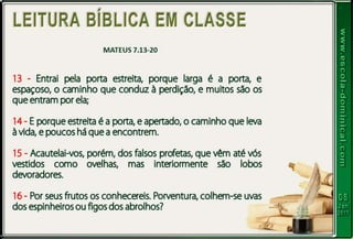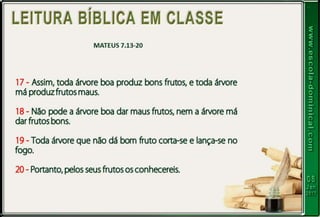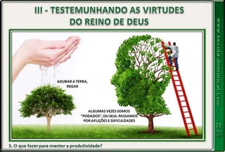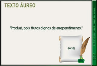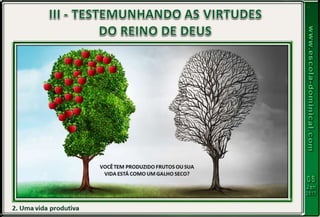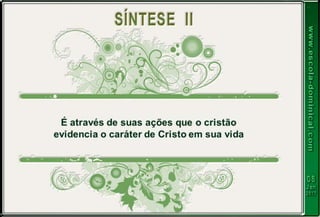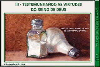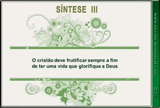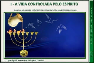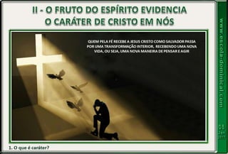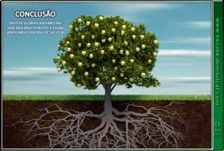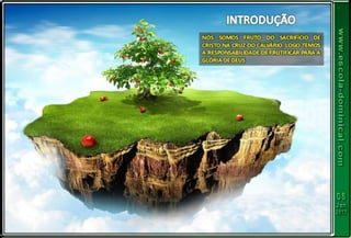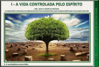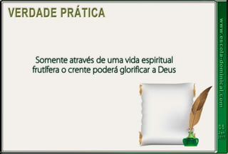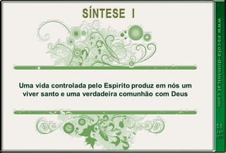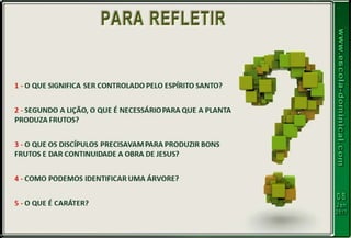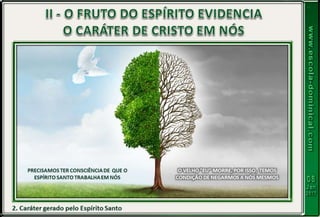 O documento aborda a importância do fruto do Espírito na vida cristã, enfatizando que devemos ser controlados pelo Espírito Santo para produzir frutos que glorificam a Deus. Destaca a necessidade de maturidade espiritual e comunhão com Deus, além de alertar sobre a influência de falsos ensinamentos. Por fim, sublinha que a vida do crente deve refletir o caráter de Cristo e que é vital manter uma vida frutífera, ligada à videira que é Jesus.