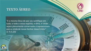 O documento discute como os crentes devem aguardar o retorno de Jesus Cristo. Ele enfatiza que 1) ninguém sabe o dia exato em que Jesus voltará, então é essencial viver em estado de preparação constante; 2) infelizmente, muitos cristãos não estão preparados para a volta de Cristo porque estão descuidados ou negligenciam o testemunho cristão; 3) é indispensável viver em santidade e cheio do Espírito Santo