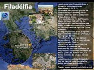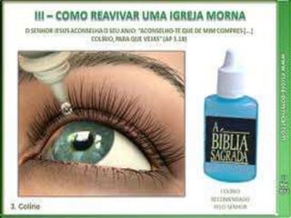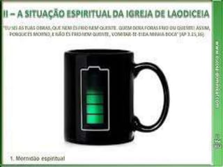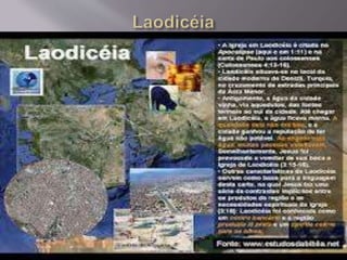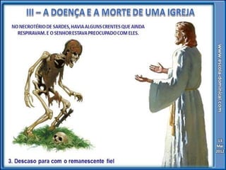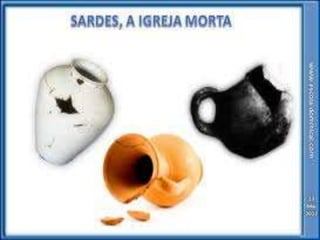 Este documento resume as mensagens de Jesus às sete igrejas de Apocalipse, começando pela igreja de Sardes. Jesus critica os crentes de Sardes por fazerem obras imperfeitas. A igreja de Sardes aparentava ser viva, mas estava espiritualmente morta. Alguns crentes permaneceram fiéis e receberiam vestes brancas. A mensagem termina discutindo a igreja de Laodicéia, que era morna, pobre, cega e nua espiritualmente.