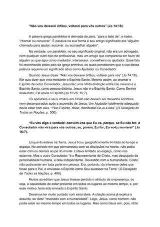 O documento resume uma lição da Escola Sabatina sobre o Espírito Santo. Discorre sobre a personalidade do Espírito Santo, descrevendo-O como um ser com inteligência, emoções e vontade própria. Também explica que o Espírito Santo é o representante de Cristo na Terra após Sua ascensão, guiando os crentes em toda a verdade.