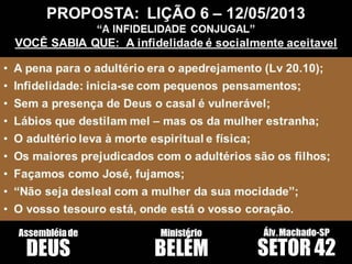 O documento discute os conflitos familiares, suas causas e como resolvê-los com a graça de Deus. Ele lista fatores que podem causar desacordos entre cônjuges como temperamentos diferentes, falta de confiança e atividades profissionais dos pais que os afastam de casa. Também aborda os problemas da má educação dos filhos e a importância da fidelidade conjugal para proteger o casal.