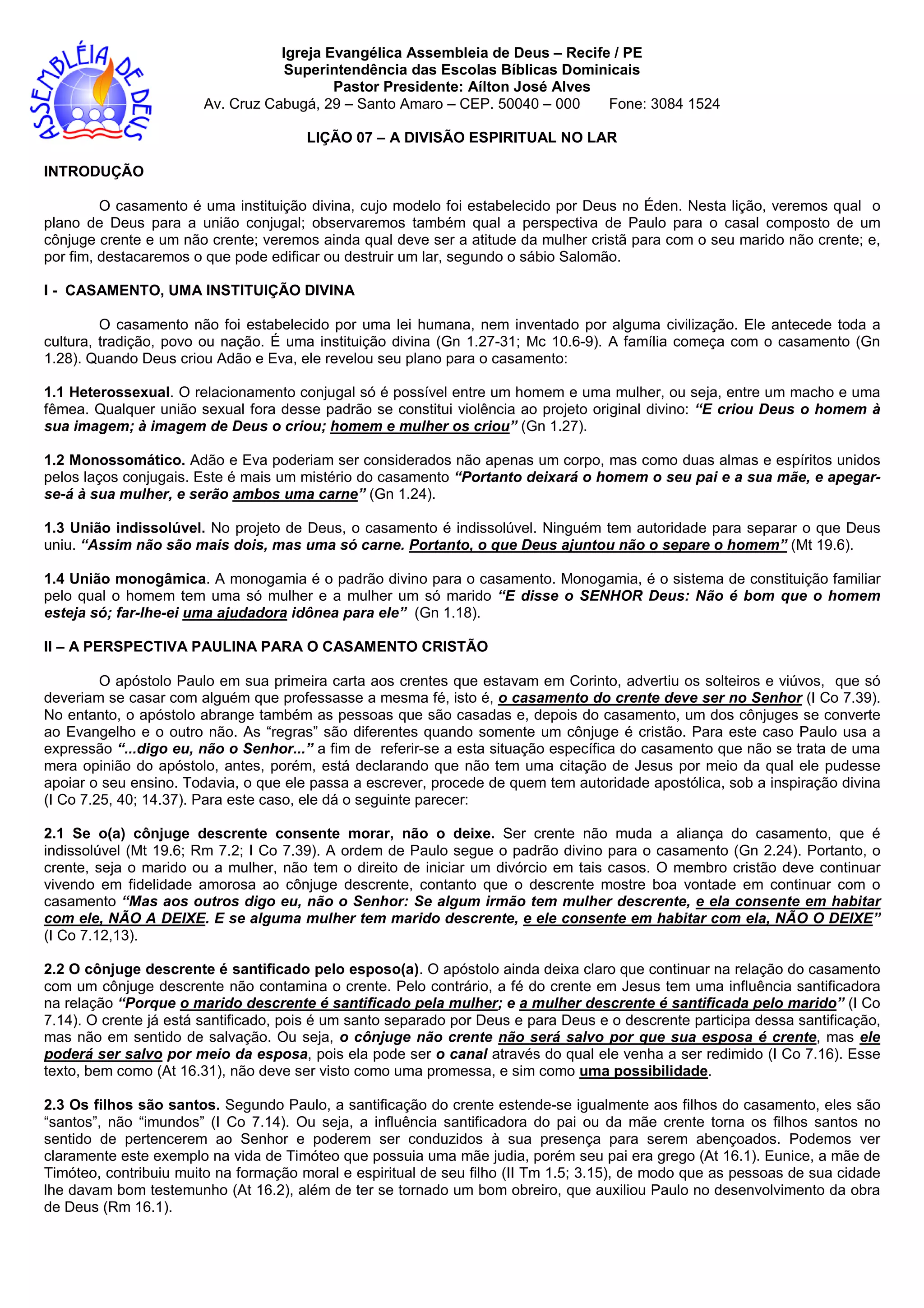 1) O documento discute a divisão espiritual no lar, com um cônjuge crente e outro não crente. 2) Paulo aconselha que o cônjuge crente não deve deixar o não crente se este consentir em permanecer no casamento. 3) A mulher crente deve viver de forma exemplar para o não crente, a fim de que ele possa ser salvo.