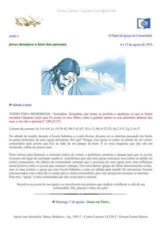O documento discute o papel da igreja na comunidade, enfatizando a importância de demonstrar amor e compaixão, seguindo o exemplo de Jesus. Utiliza a história de Jonas e a entrada triunfal de Jesus em Jerusalém para ilustrar atitudes de obediência, misericórdia e o desejo de alcançar os perdidos. Encoraja os jovens a se envolverem em projetos que melhorem suas comunidades e a adotar uma mentalidade de serviço altruísta.