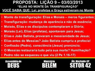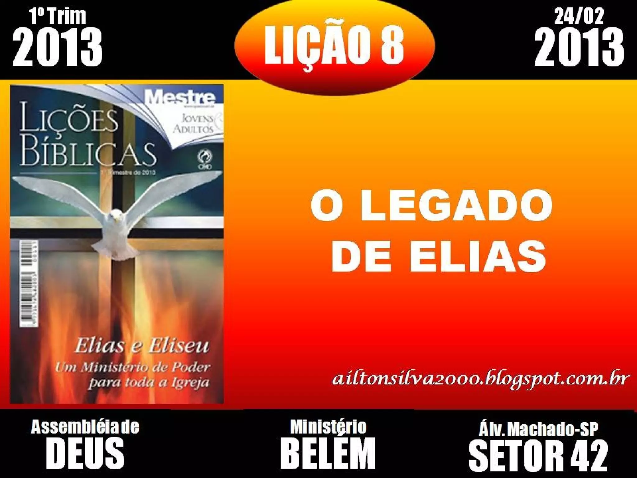 O documento discute a sucessão de Elias por Eliseu. Apresenta que Elias, sentindo-se só, recebeu revelação de Deus mostrando que havia outros servos fieis e que Eliseu seria seu sucessor. Eliseu mostrou-se vigilante e fiel ao seguir e servir Elias, recebendo a unção e a porção dobrada de Elias. Sua chamada e discipulado prepararam-no para dar continuidade ao legado de fé e serviço de Elias.