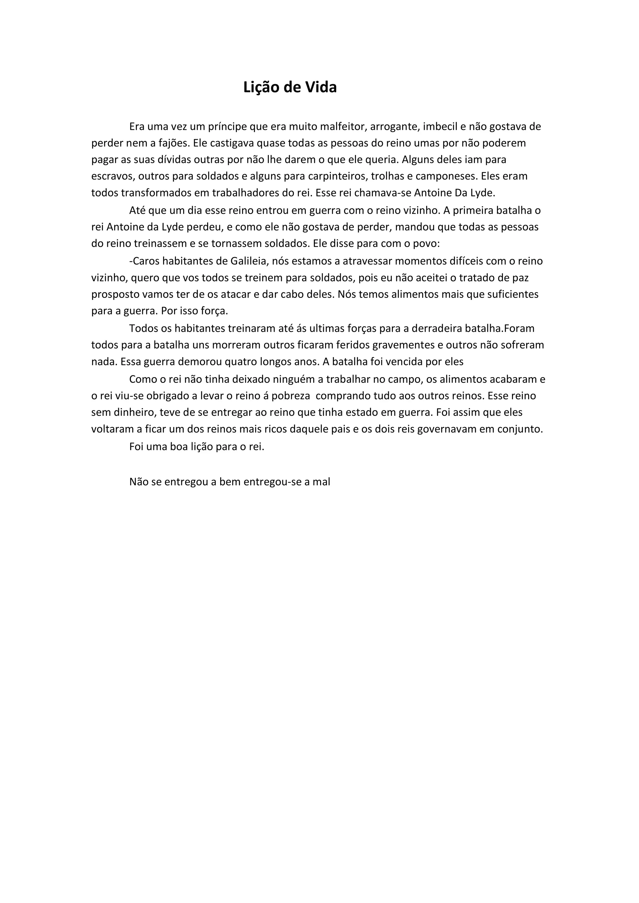 O rei Antoine Da Lyde era arrogante e mandava punir severamente seu povo. Quando seu reino entrou em guerra, ordenou que todos treinassem como soldados, resultando na vitória após 4 anos, mas também na fome e pobreza pois ninguém cultivava comida. O reino teve de se render ao inimigo, ensinando ao rei uma lição sobre tratar melhor seu povo.