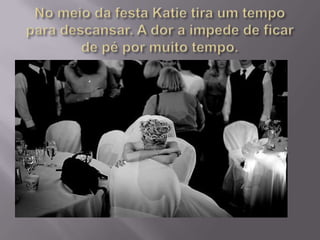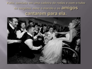 O documento descreve a história de Katie e Nick, um casal que se casou apesar da Katie estar com câncer terminal. A foto mostra o casal pouco antes da cerimônia, com a Katie recebendo tratamento e o Nick aguardando ao seu lado. Apesar das dificuldades, a Katie quis realizar todos os detalhes do casamento. Ela faleceu cinco dias depois, mas o documento ressalta a importância de valorizarmos cada momento da vida.