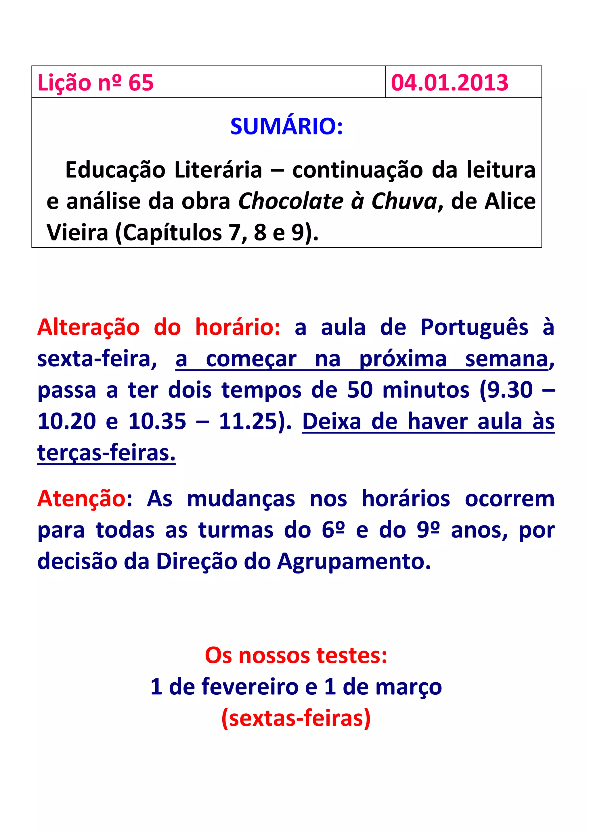 O documento discute alterações no horário de aula de Português às sextas-feiras, com dois tempos de 50 minutos cada, e também informa que não haverá mais aula às terças-feiras. Os alunos devem fazer uma cópia de texto e exercícios de leitura e gramática para segunda-feira, sem precisar trazer o manual.