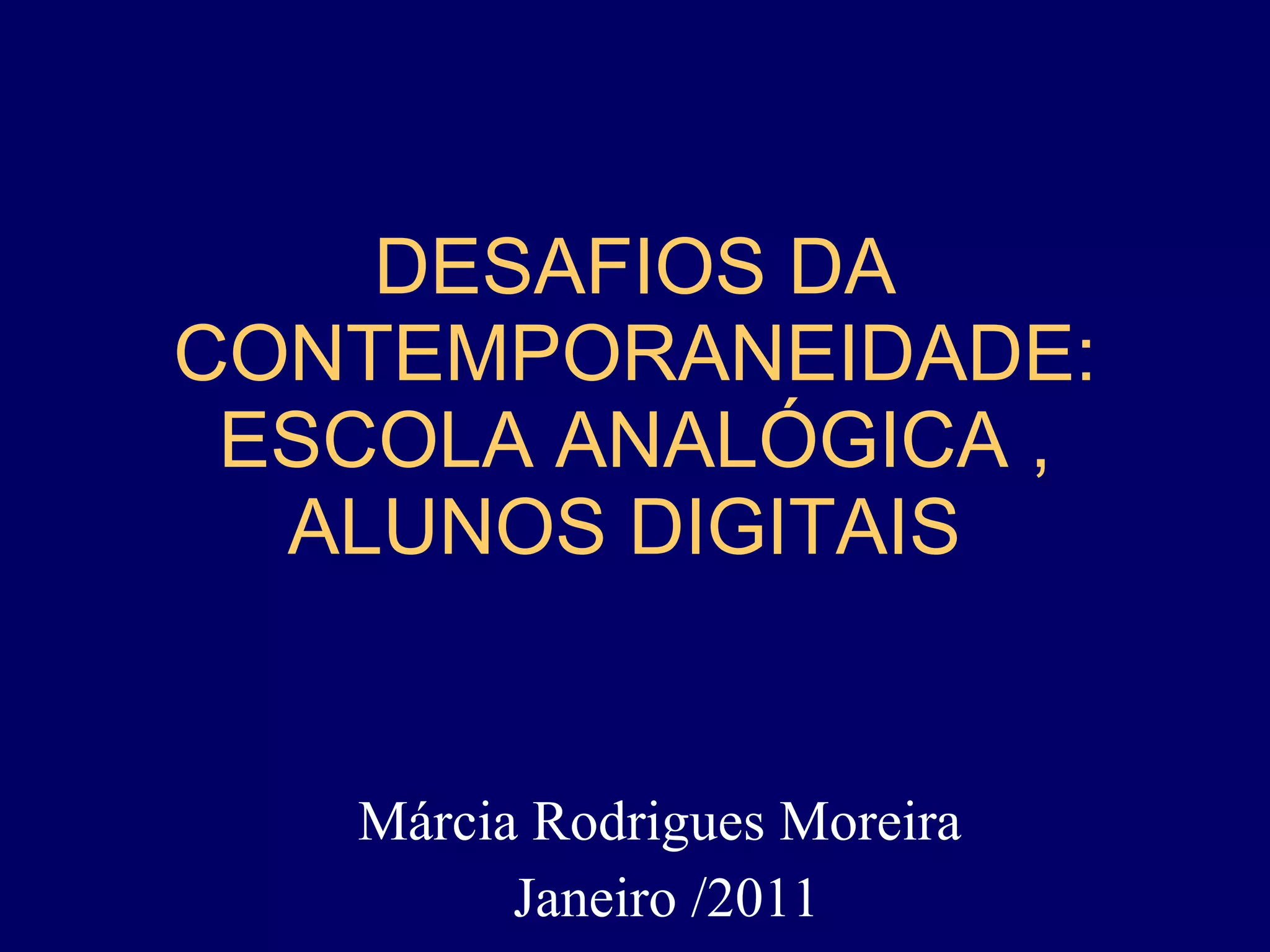 1) A educação atual enfrenta desafios para educar crianças e jovens em uma sociedade cada vez mais digitalizada, enquanto as escolas ainda usam métodos analógicos do passado.