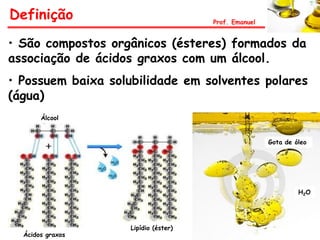 [1] Lipídios são compostos orgânicos formados da associação de ácidos graxos com álcool, com baixa solubilidade em água. [2] Eles têm funções como fonte de energia, isolamento térmico, formação de membranas e hormônios. [3] Lipídios incluem glicerídeos, cerídeos, esteróides e fosfolipídeos.