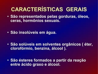 CARACTERÍSTICAS GERAISSão representados pelas gorduras, óleos, ceras, hormônios sexuais. São insolúveis em água. São solúveis em solventes orgânicos ( éter, clorofórmio, benzina, álcool ). São ésteres formados a partir da reação entre ácido graxo e álcool.