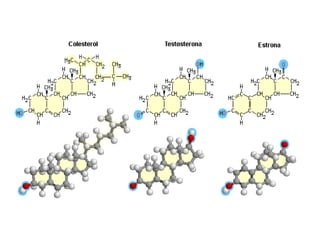 O documento discute os lipídios, incluindo sua composição, tipos, estrutura e importância biológica. Os lipídios são moléculas orgânicas apolares que incluem glicerídeos, cerídeos, esteroides e fosfolipídios. Os glicerídeos como os triglicerídeos armazenam energia e formam gorduras e óleos. Os esteroides incluem o colesterol, importante para a estrutura das membranas celulares.