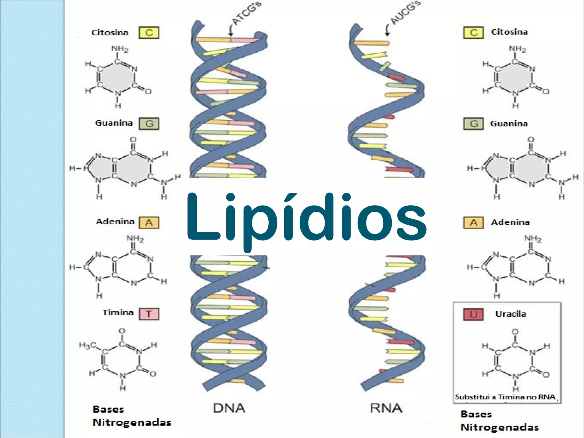 Lipídios são representados por gorduras, óleos e hormônios sexuais. Eles são ésteres formados por ácidos graxos e álcool, insolúveis em água mas solúveis em solventes orgânicos. Lipídios têm funções como fonte de energia, proteção, estrutura e transporte e são classificados em glicerídeos, cerídeos, esteróides e lipídios complexos.