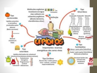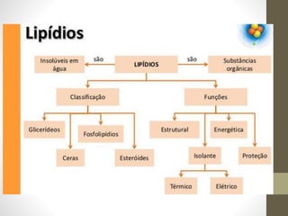 O documento discute os lipídios, incluindo sua importância como reserva energética, armazenamento e funções no corpo. Os lipídios podem ser triglicerídeos, cerídeos, fosfolipídeos ou esteróides e desempenham papéis como isolantes térmicos e elétricos e na formação de membranas e hormônios. A dieta rica em colesterol, gorduras e triglicerídeos pode levar à aterosclerose e problemas cardiovasculares.