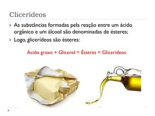 O documento discute os principais tipos de lipídios no corpo, incluindo glicerídeos, cerídeos, esteróides e fosfolipídios. Glicerídeos incluem gorduras e óleos e armazenam energia. Cerídeos formam ceras protetoras. O colesterol é um esteróide importante para membranas celulares e hormônios, e níveis altos podem causar doenças cardíacas. Fosfolipídios são os principais componentes das membranas