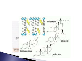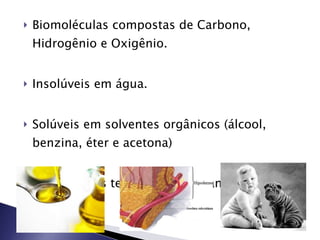Lipídios são biomoléculas compostas de carbono, hidrogênio e oxigênio, insolúveis em água e solúveis em solventes orgânicos. Incluem gorduras, óleos, ceras, carotenoides, fosfolipídios, esteróides e glicerídeos, que atuam como fonte de energia, proteção mecânica e estrutural, e na composição de membranas celulares. Colesterol e hormônios como a vitamina D também são lipídios importantes no corpo humano