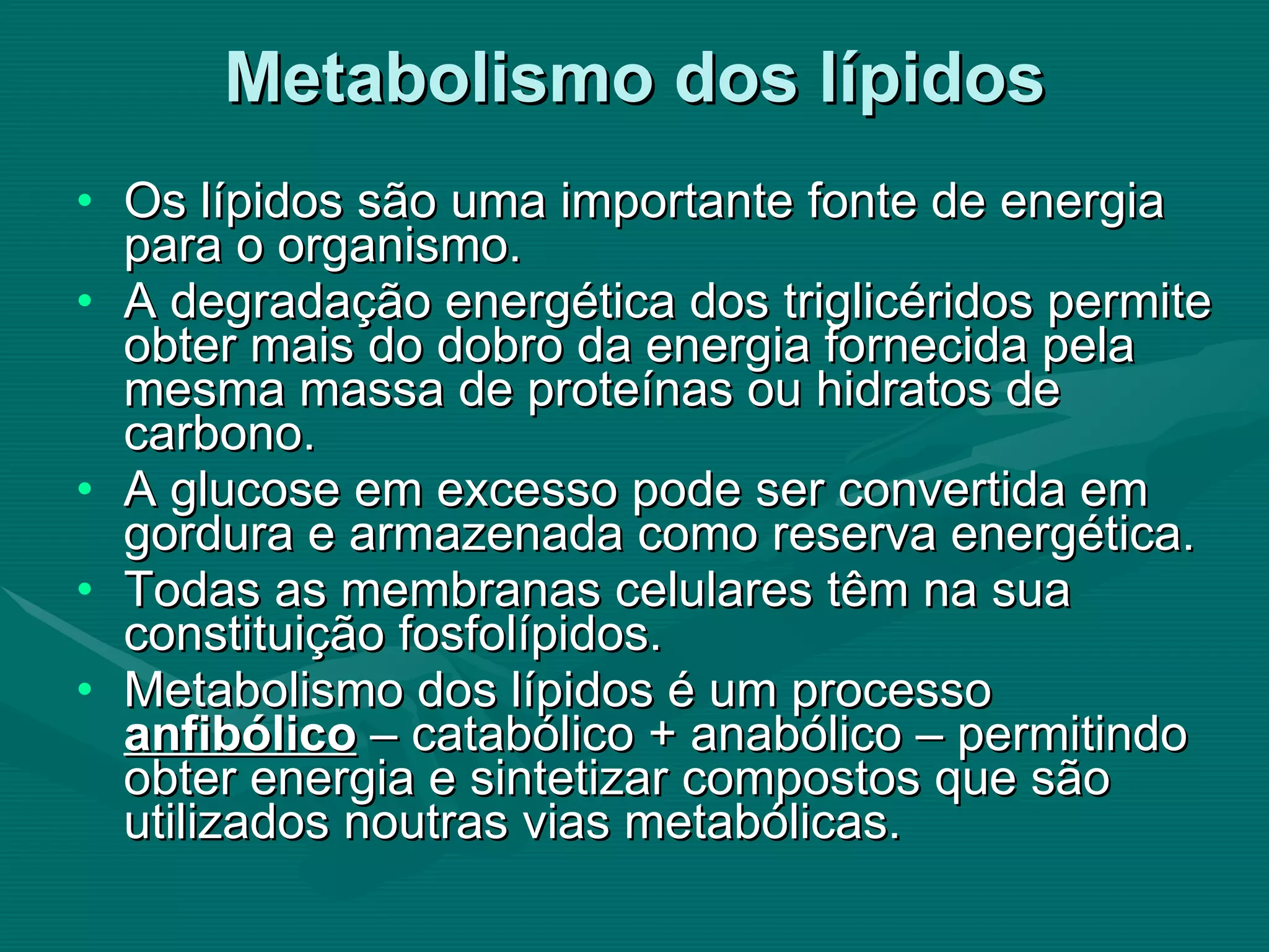 O documento discute o metabolismo dos lípidos no corpo humano. Os principais pontos são: (1) Os lípidos são uma importante fonte de energia e podem ser armazenados como gordura; (2) Os lípidos são metabolizados através de processos catabólicos que liberam energia e processos anabólicos que sintetizam novos lípidos; (3) Os principais processos envolvidos no metabolismo dos lípidos incluem a lipólise, β-oxidação e síntese de ácidos grax