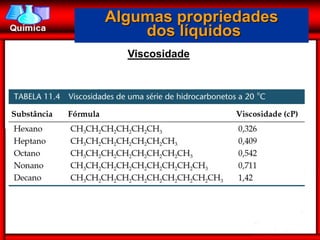 O documento descreve propriedades fundamentais dos líquidos, incluindo: (1) viscosidade, que é a resistência de um líquido em fluir; (2) tensão superficial, que é a energia necessária para aumentar a área superficial de um líquido; e (3) mudanças de fase entre sólido, líquido e gás.