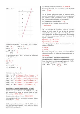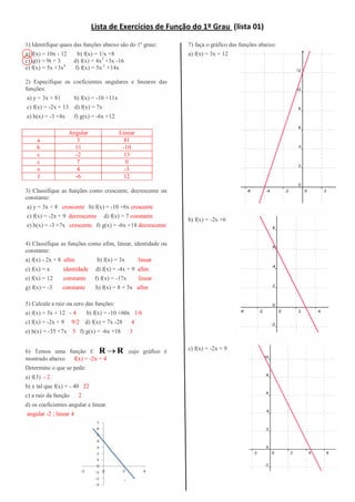 1) O documento apresenta uma lista de exercícios sobre funções do 1o grau, incluindo identificar funções do 1o grau, especificar coeficientes angulares e lineares, classificar funções como crescentes, decrescentes ou constantes, calcular raízes e zeros de funções, determinar valores de funções, calcular preços que sofrem alterações lineares no tempo, e resolver problemas envolvendo funções do 1o grau aplicadas a situações reais.