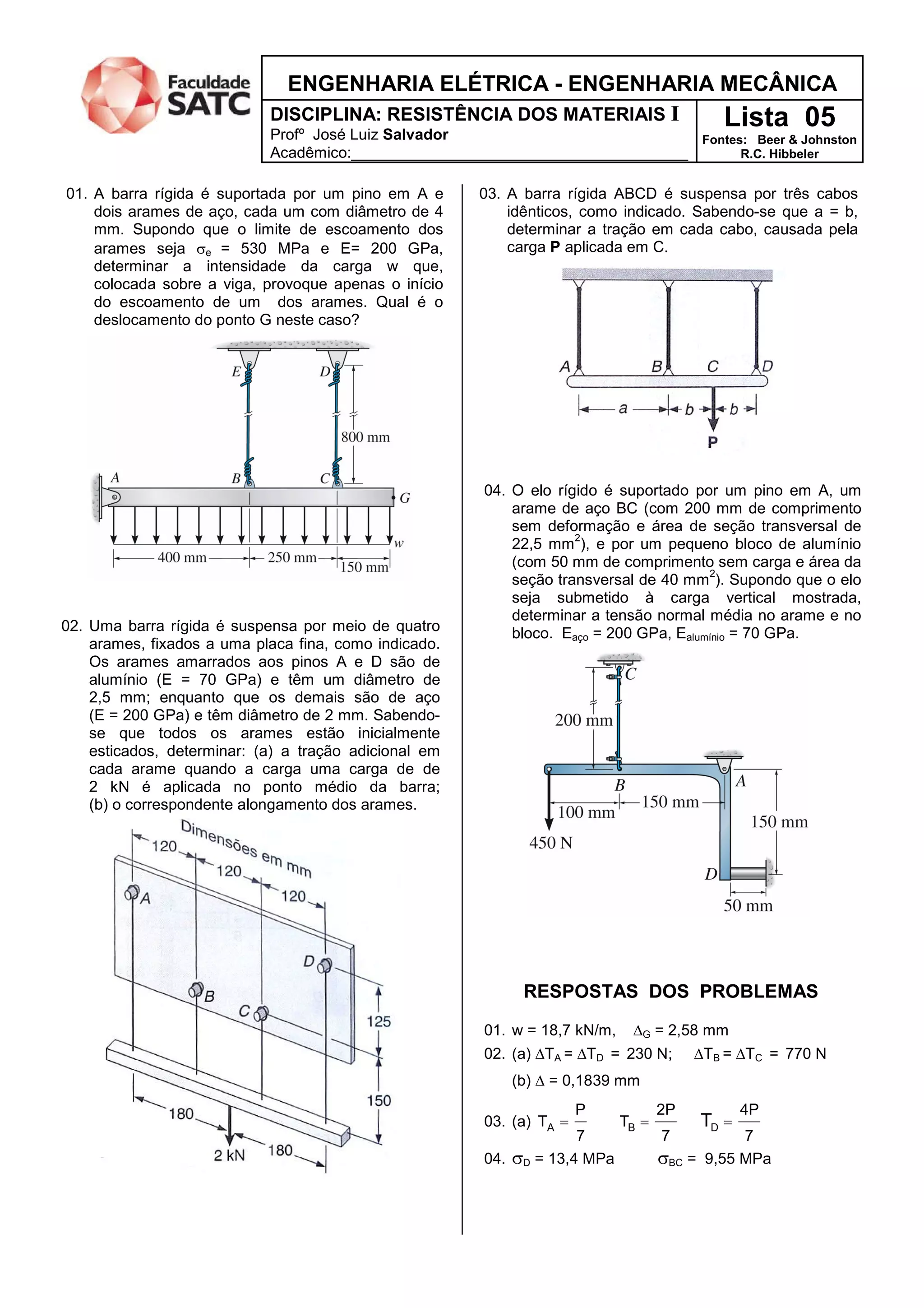 2) Quando uma carga de 2 kN é aplicada no ponto médio da barra, a tração adicional nos arames de alumínio é de 230 N e nos arames de aço é de 770 N, com alongamento de 0,1839 mm.