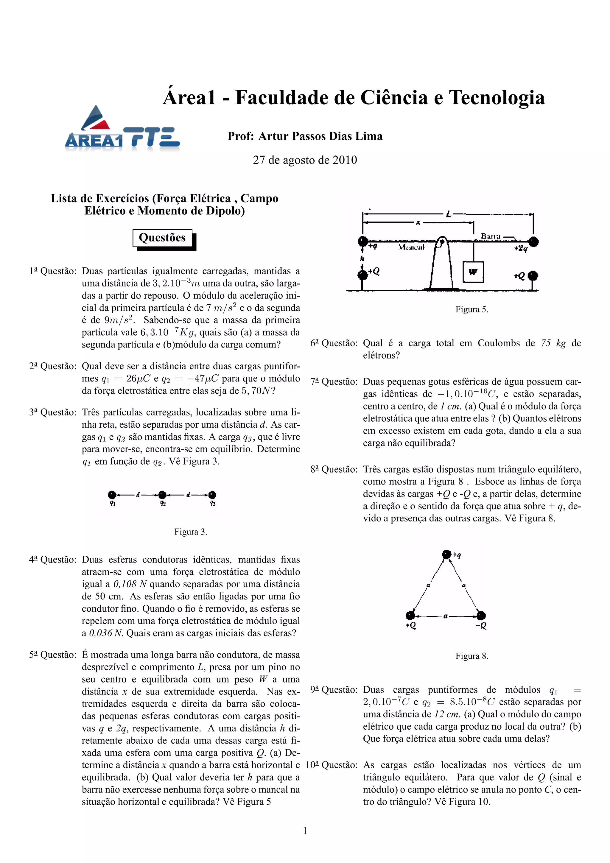 1) O documento apresenta uma lista de 19 questões sobre força elétrica, campo elétrico e momento de dipolo. 2) As questões abordam tópicos como carga elétrica, força entre partículas carregadas, campo elétrico criado por diferentes configurações de cargas e momento de dipolo elétrico. 3) Resoluções detalhadas são fornecidas para alguns itens, enquanto outros devem ser resolvidos em sala de aula.
