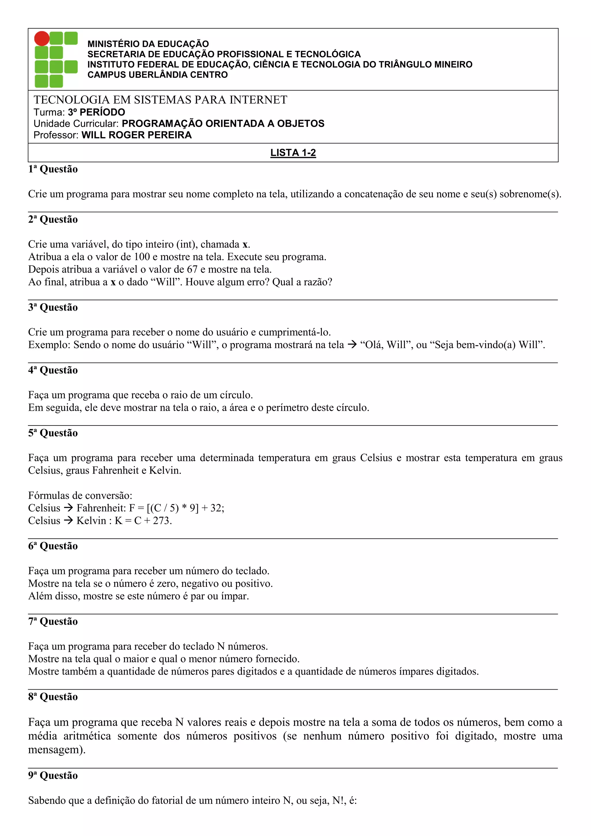 Este documento apresenta 10 questões de programação orientada a objetos para serem resolvidas. As questões incluem: 1) mostrar o nome completo do aluno; 2) atribuir valores inteiros a uma variável e mostrar na tela; 3) receber o nome do usuário e cumprimentá-lo; 4) calcular o raio, área e perímetro de um círculo; 5) converter temperaturas entre Celsius, Fahrenheit e Kelvin; 6) analisar se um número é positivo, negativo, par ou ímpar; 7) encontrar o maior e menor número