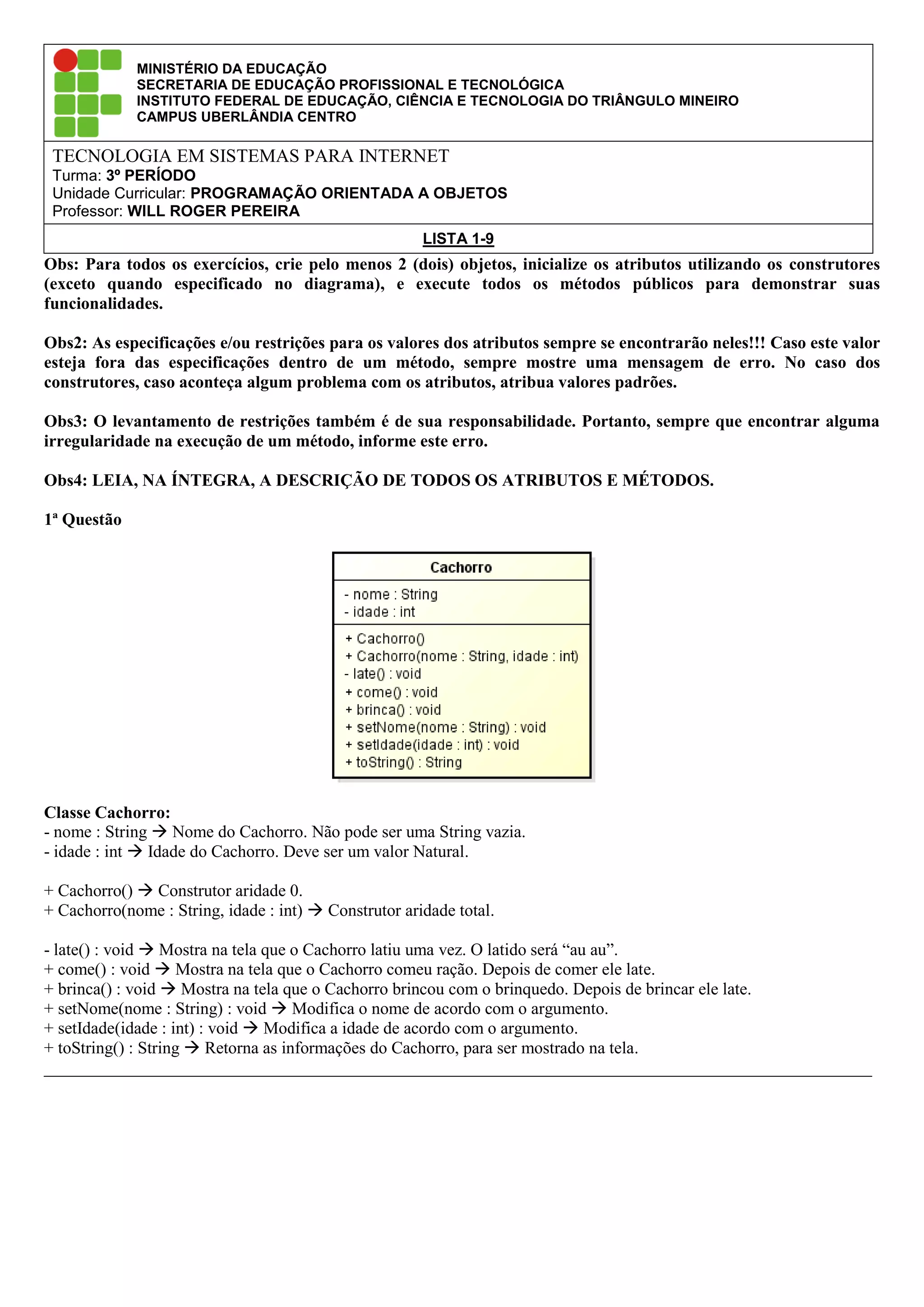 O documento apresenta 9 questões sobre programação orientada a objetos, definindo classes como Cachorro, Retângulo, ContaPoupança e outras. Cada questão descreve os atributos e métodos de uma classe, com instruções e observações sobre a implementação dos exercícios solicitados.