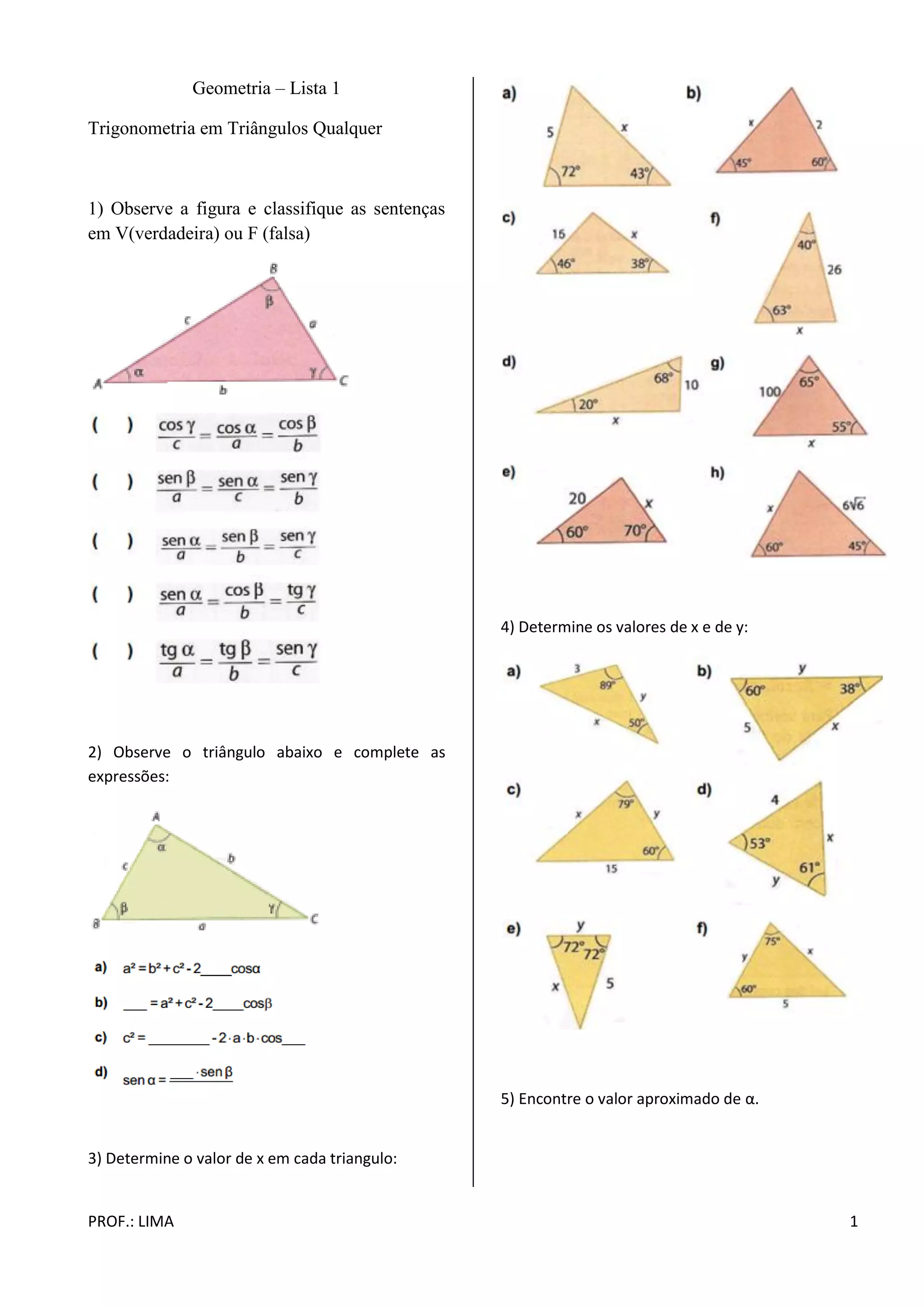 O documento apresenta 10 exercícios de geometria e trigonometria envolvendo triângulos, paralelogramos e distâncias entre pontos. Os exercícios pedem para classificar sentenças como verdadeiras ou falsas, completar expressões trigonométricas, calcular valores de ângulos e lados de figuras geométricas, e encontrar distâncias entre pontos dados em esquemas.
