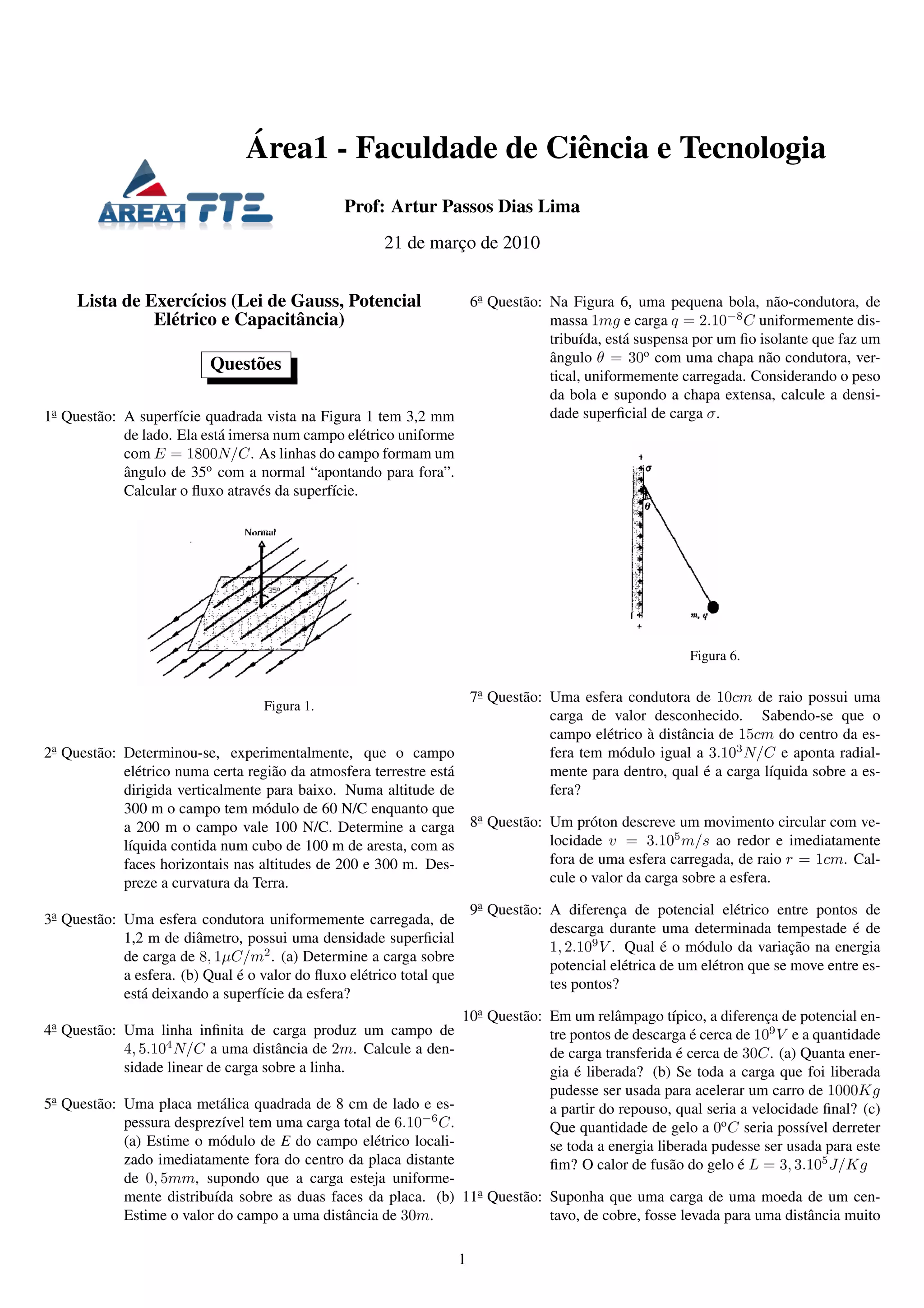 1) O documento apresenta 10 questões sobre conceitos de eletrostática como campo elétrico, potencial elétrico e capacitância.